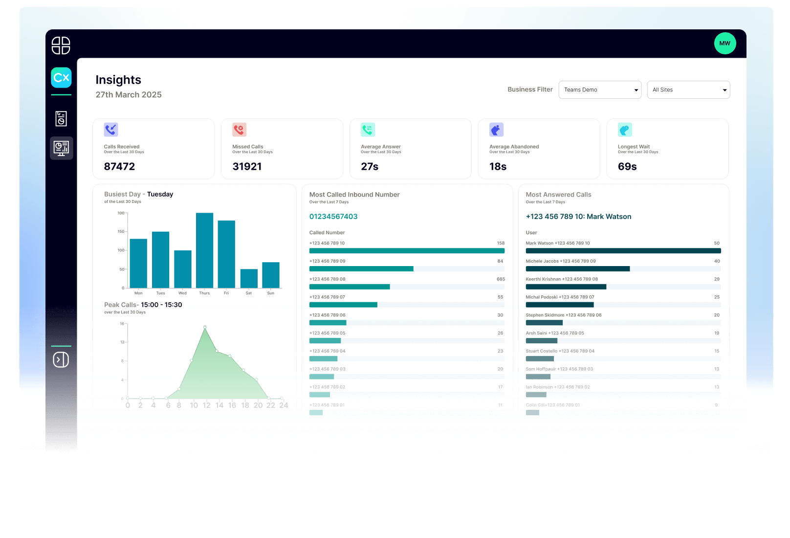 Our Teams Call Reporting solution tracks several key call metrics, delivering comprehensive reporting for historical call lists, unreturned/lost calls, calls by a specific number, calls by DID, calls by specific times and days of the week, and more.